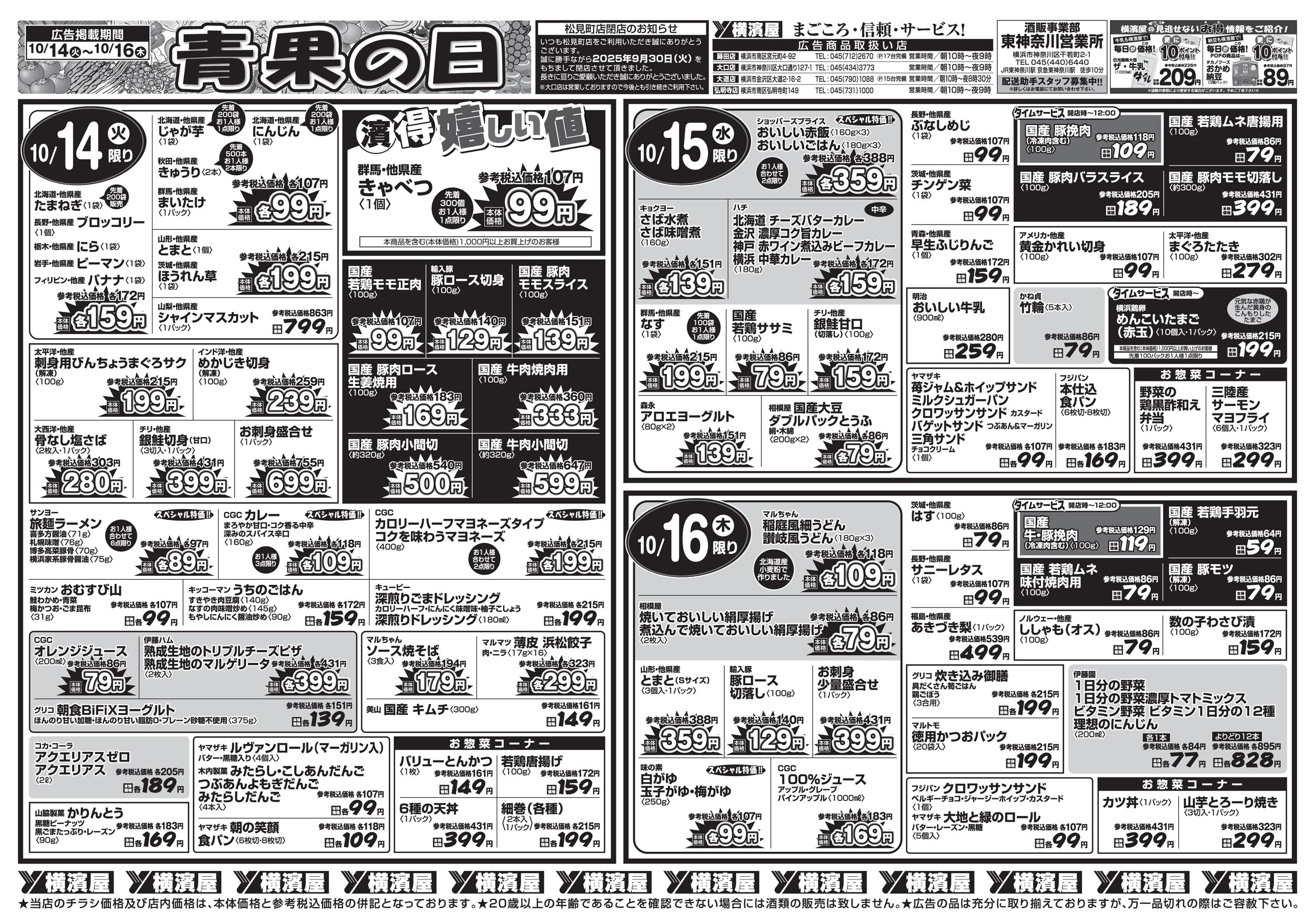 横浜市金沢区、横浜市神奈川区、横浜市南区 スーパー横濱屋 創業明治20年、長い歳月でつちかった伝統を生かし、「まごころ・信頼・サービス」をお届けします。 ピックアップニュース ネットチラシ クチコミを見る・投稿する ネットチラシ 広告有効期限:2025.10.14~2025.10.20 その他のネットチラシ 周辺のチラシを見る 周辺情報 グルメ ショッピング 車・バイク 住宅 暮らし 趣味・レジャー 美容・健康 周辺情報はありません このお店のTOPページへ 045-712-2670 twitter Facebook Google+