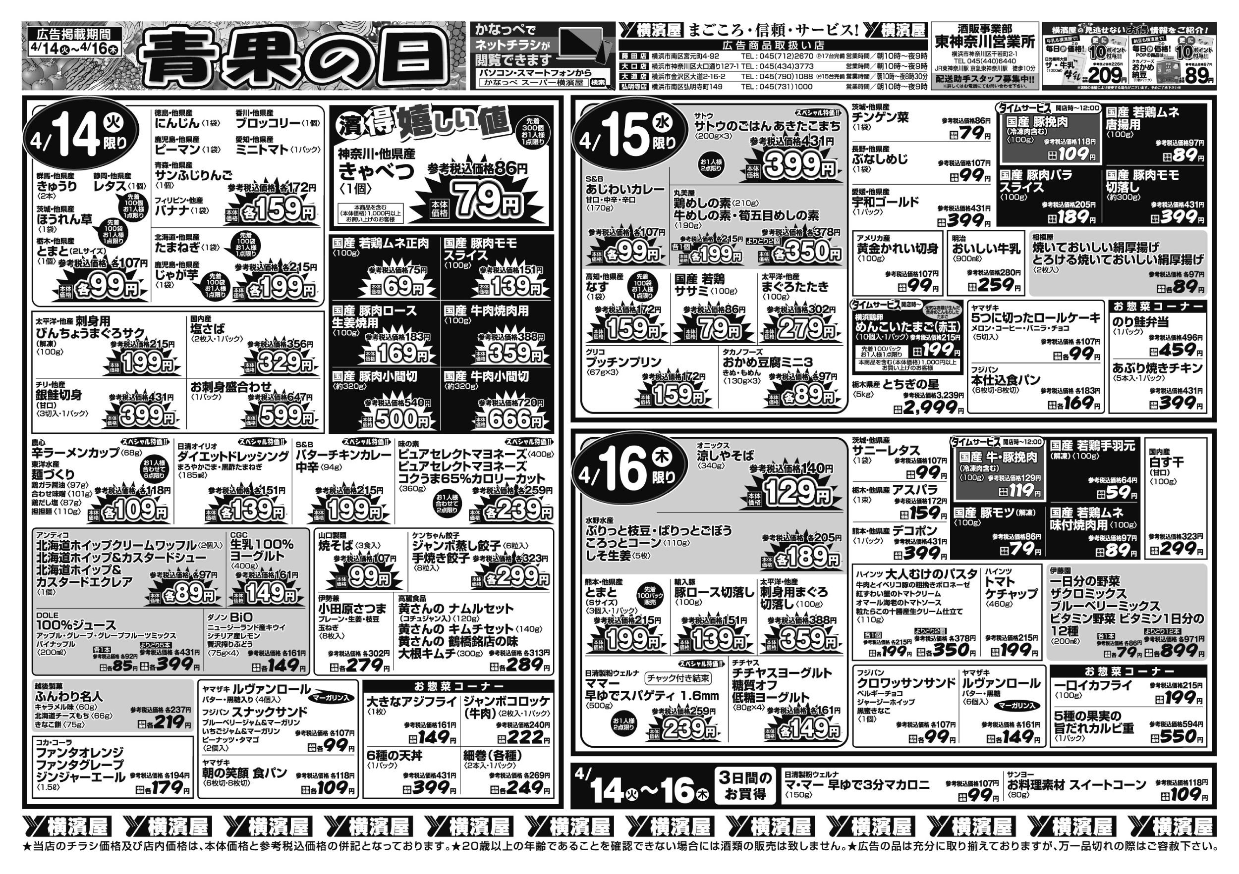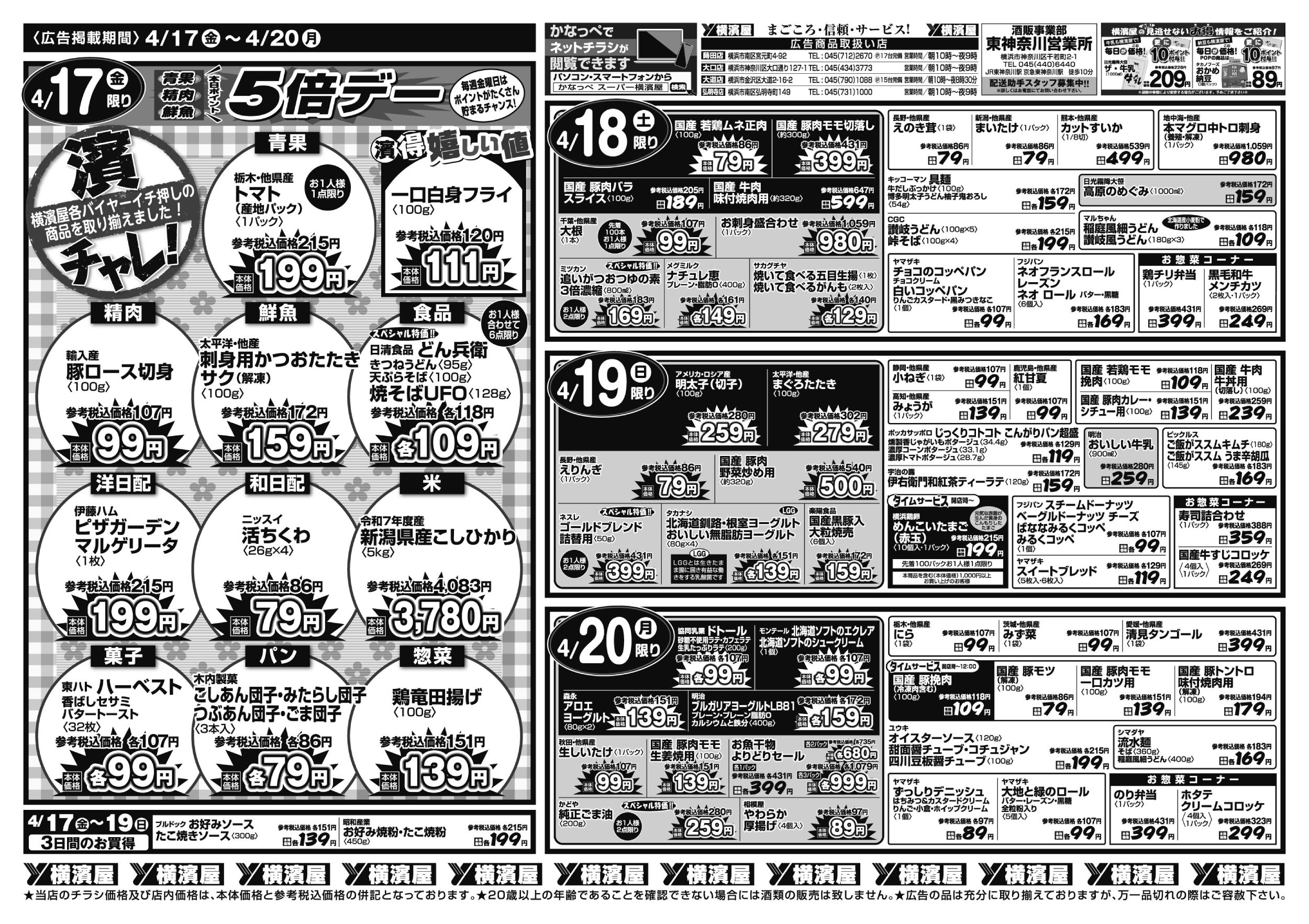 横浜市金沢区、横浜市神奈川区、横浜市南区 スーパー横濱屋 創業明治20年、長い歳月でつちかった伝統を生かし、「まごころ・信頼・サービス」をお届けします。 ピックアップニュース ネットチラシ クチコミを見る・投稿する ネットチラシ 広告有効期限:2026.04.14~2026.04.20 その他のネットチラシ 周辺のチラシを見る 周辺情報 グルメ ショッピング 車・バイク 住宅 暮らし 趣味・レジャー 美容・健康 周辺情報はありません このお店のTOPページへ 045-712-2670 twitter Facebook Google+