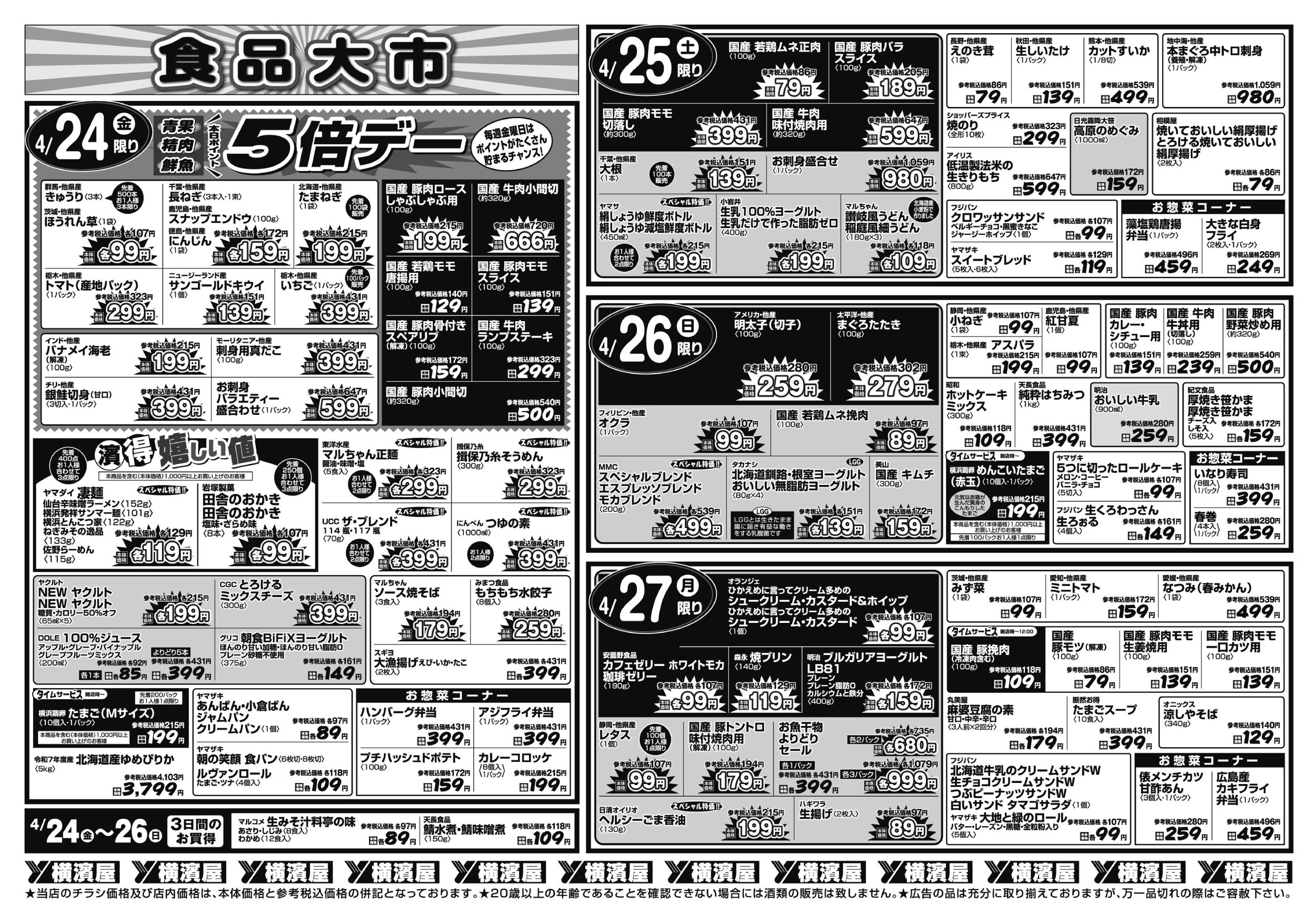 横浜市金沢区、横浜市神奈川区、横浜市南区 スーパー横濱屋 創業明治20年、長い歳月でつちかった伝統を生かし、「まごころ・信頼・サービス」をお届けします。 ピックアップニュース ネットチラシ クチコミを見る・投稿する ネットチラシ 広告有効期限:2026.04.21~2026.04.27 その他のネットチラシ 周辺のチラシを見る 周辺情報 グルメ ショッピング 車・バイク 住宅 暮らし 趣味・レジャー 美容・健康 周辺情報はありません このお店のTOPページへ 045-712-2670 twitter Facebook Google+
